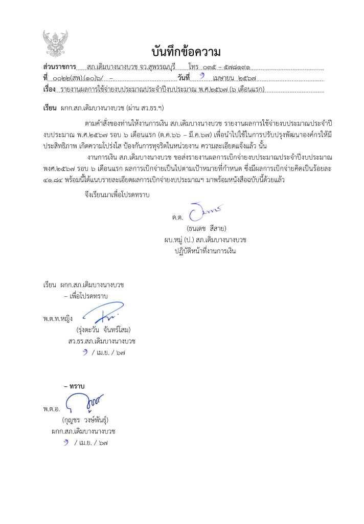 บันทึกรายงานผลการใช้จ่ายงบประมาณประจำปี พ.ศ.2567 (6 เดือนแรก)