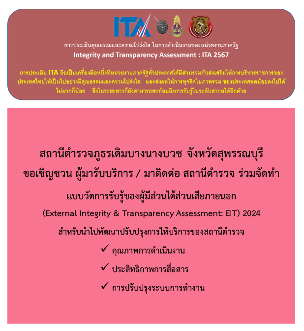 สถานีตำรวจภูธรเดิมบางนางบวช ได้ดำเนินการประชุมการขับเคลื่อนการประเมินคุณธรรมและความโปร่งใสในการดำเนินงานของหน่วยงานภาครัฐ (Integrity and Transparency Assessment: ITA) ของสถานีตำรวจ ประจำปีงบประมาณ พ.ศ. 2567 โดยมี พันตำรวจเอก กุญชร วงษ์พันธุ์ ผู้กำกับการสถานีตำรวจภูธรเดิมบางนางบวช เป็นประธานการประชุม ซึ่งการประชุมดังกล่าวมีวัตถุประสงค์เพื่อแจ้งคำสั่งแต่งตั้งคณะกรรมการขับเคลื่อนการประเมินคุณธรรมและความโปร่งใสในการดำเนินงานของหน่วยงานภาครัฐ (Integrity and Transparency Assessment: ITA) ของสถานีตำรวจ และทำความเข้าใจ กรอบการประเมินคุณธรรมและความโปร่งใสในการดำเนินงานของหน่วยงานภาครัฐ (Integrity and Transparency Assessment: ITA) ของสถานีตำรวจ ประจำปีงบประมาณ พ.ศ. 25667 ประกอบด้วย 3 ประเด็นสำคัญ ได้แก่