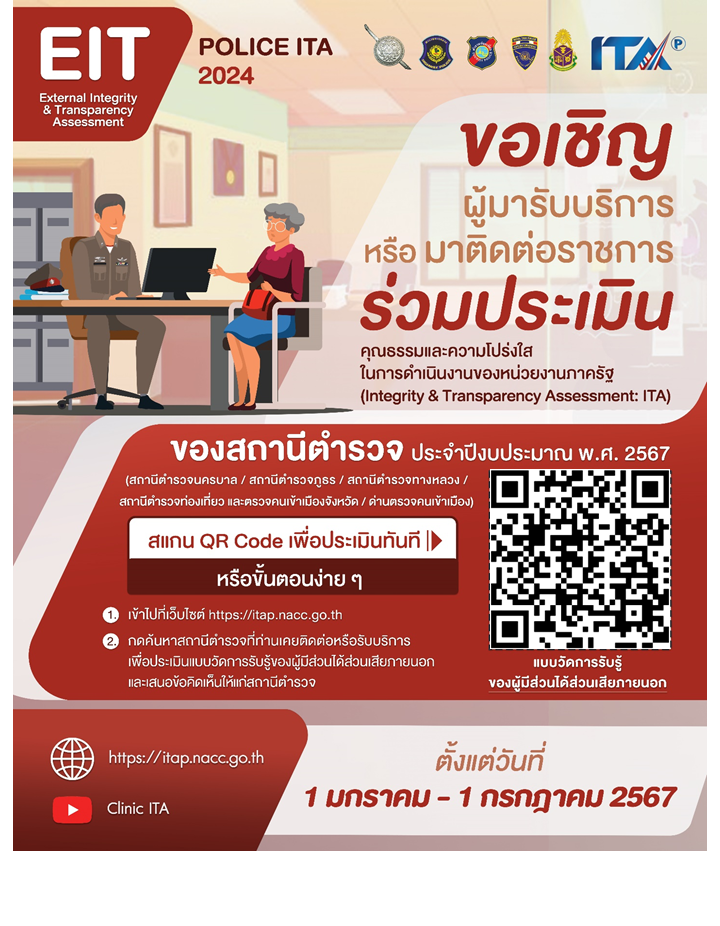 3. แบบวัดการรับรู้ของผู้มีส่วนได้ส่วนเสียภายนอก (External Integrity and Transparency Assessment: EIT) – ให้สถานีตำรวจนำช่องทางการเปิดเผยข้อมูลสาธารณะ (OIT) เปิดเผย ณ จุดให้บริการ และพัฒนา การให้บริการเพื่อสร้างความรวดเร็วและความสะดวกให้แก่ประชาชน ก่อนทำการประเมินแบบวัดการรับรู้